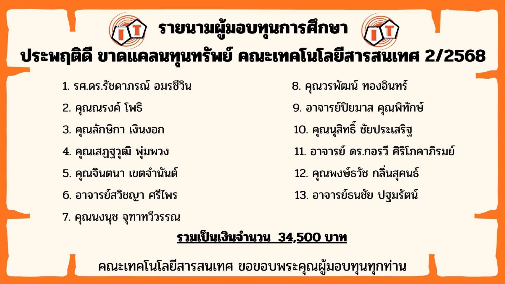 คณะเทคโนโลยีสารสนเทศ ขอขอบพระคุณผู้มีอุปการคุณทุกท่าน ที่ร่วมมอบทุนการศึกษา “ประพฤติดี ขาดแคลนทุนทรัพย์” ประจำภาคเรียนที่ 2/2568