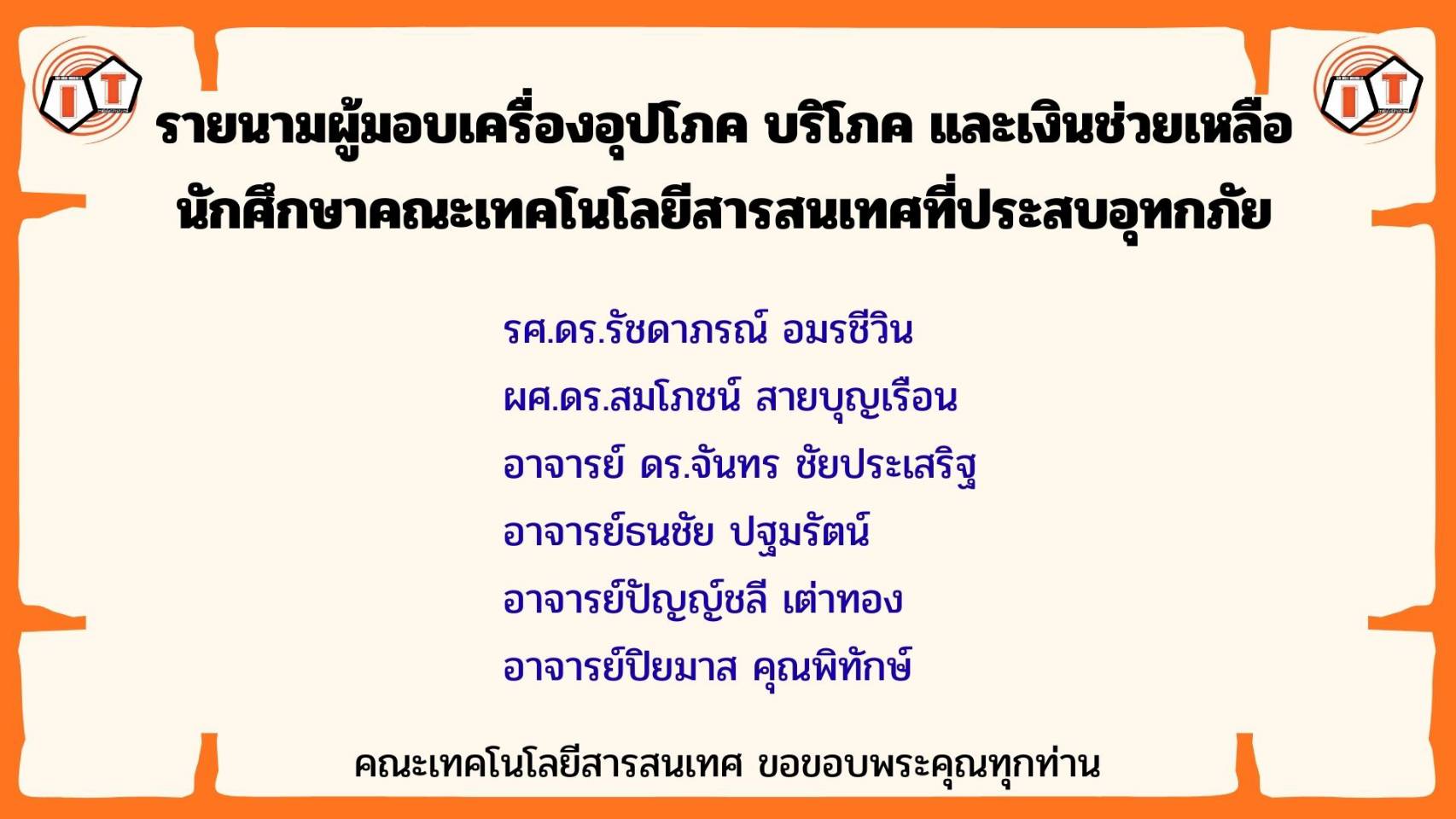 และขอขอบพระคุณผู้มีจิตเมตตาทุกท่าน ที่ร่วมมอบเครื่องอุปโภค บริโภค และเงินช่วยเหลือเพื่อสนับสนุนนักศึกษาที่ประสบอุทกภัย